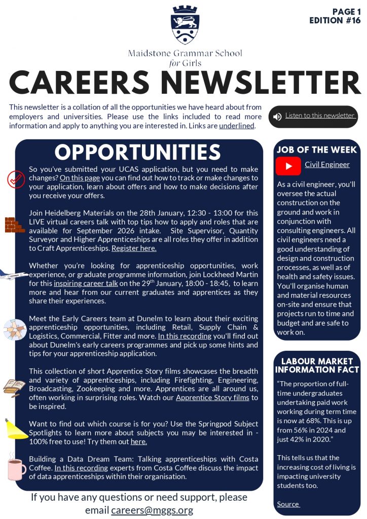 This week’s Careers Newsletter includes guidance on making changes to UCAS applications, virtual career talks with employers such as Heidelberg Materials and Lockheed Martin, apprenticeship opportunities with Dunelm and Costa Coffee, and Springpod Subject Spotlights to help you explore different courses. You’ll also find inspiring Apprentice Story videos, upcoming webinars on engineering and career planning, plus our Job of the Week: Civil Engineer, and a useful labour-market fact about students working during term time.