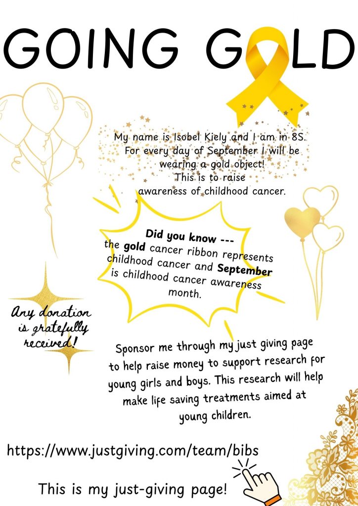For every day of September, I will be wearing something gold! This is to raise awareness of childhood cancer. The gold cancer ribbon represents childhood cancer and September is childhood cancer awareness month. All I ask of you is that you sponsor me through my Just Giving page to help raise money to support help for all the young girls and boys. This support will help get families through some of the toughest times. I was fortunate enough to ring the bell in October 2024 to signal the end of my treatment. But I wouldn’t have made it through the beginning if it wasn’t for them. Will you help me raise awareness?