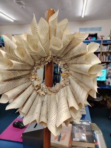 The Book Craft have been recycling old and damaged books into new things, thinking about the various celebrations this term. We started the term making 3D pumpkins (Halloween), which we decorated with poppies for Armistice Day. Then we started to get ready for Christmas, making cards to sell, wreaths for our doors and Christmas trees.