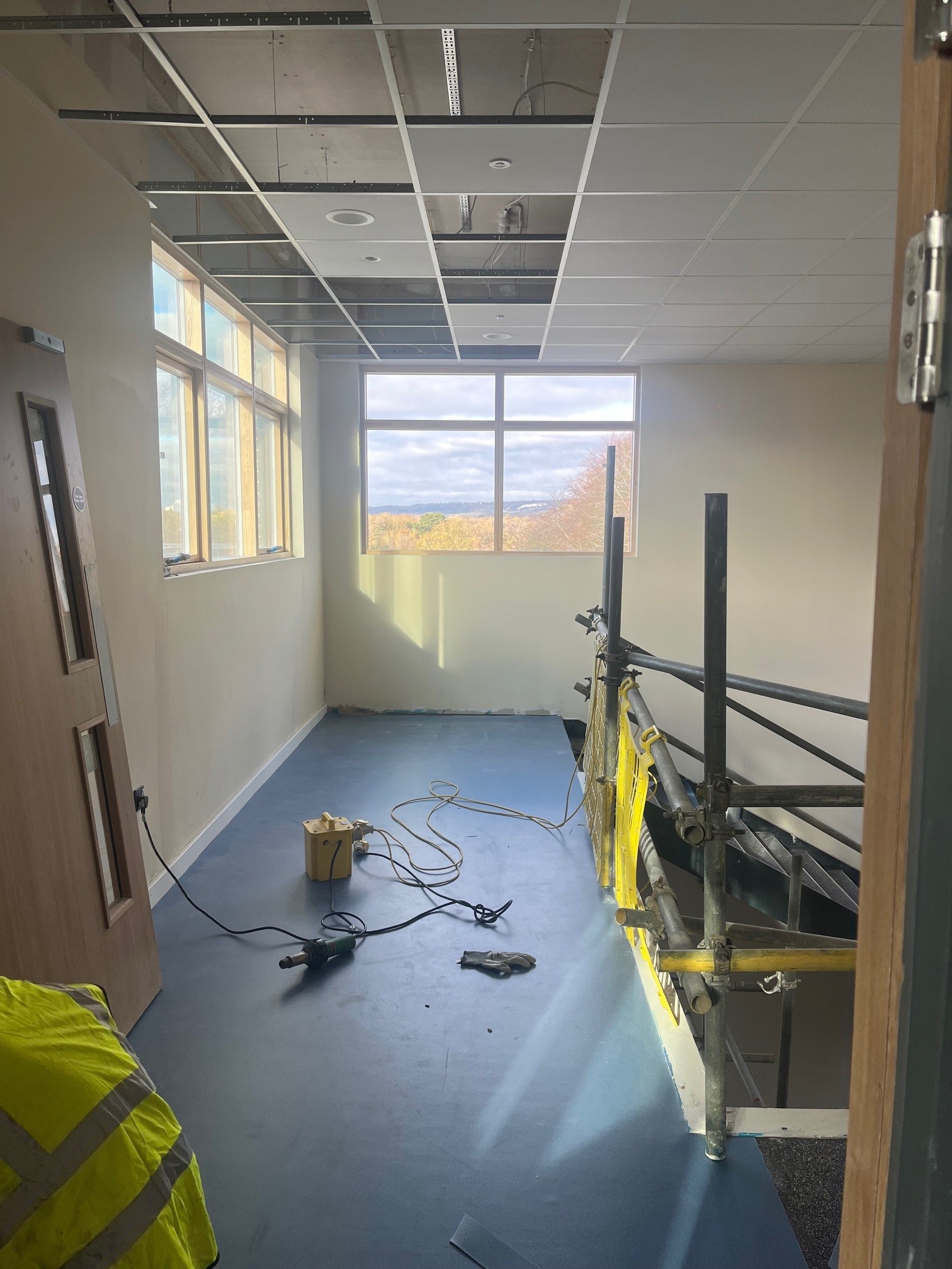 • Stair 2 is catching up fast! Latex works are complete and vinyl installation is now underway, hot on the heels of the fully finished Stair 1.