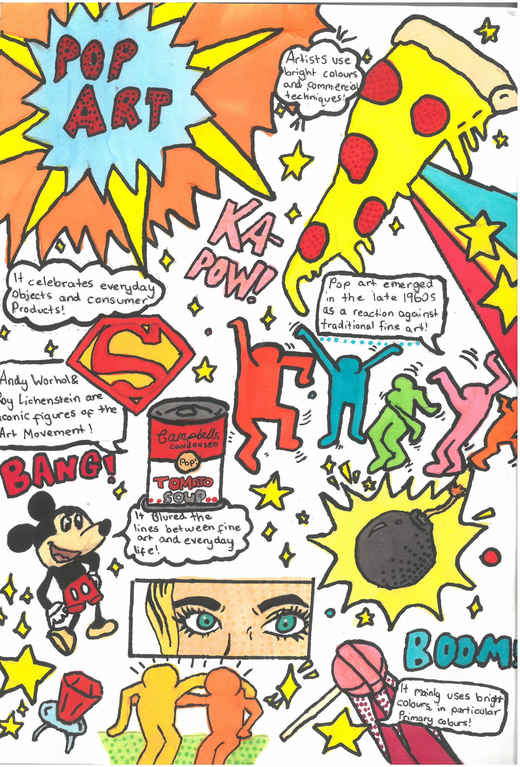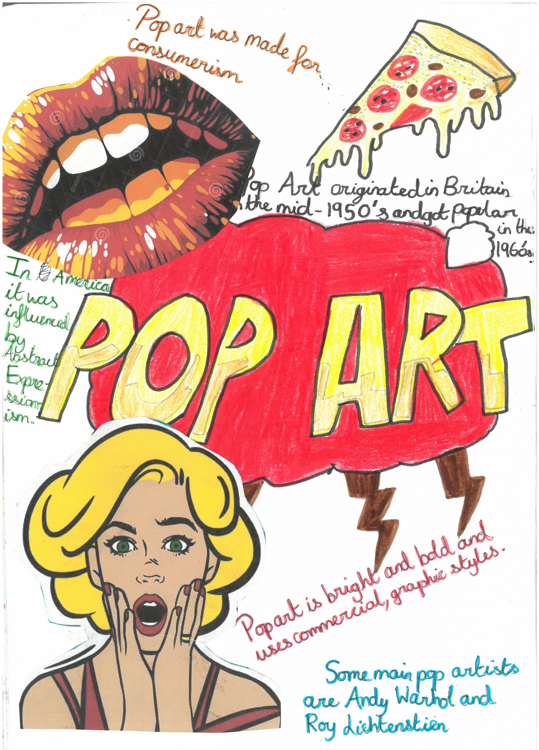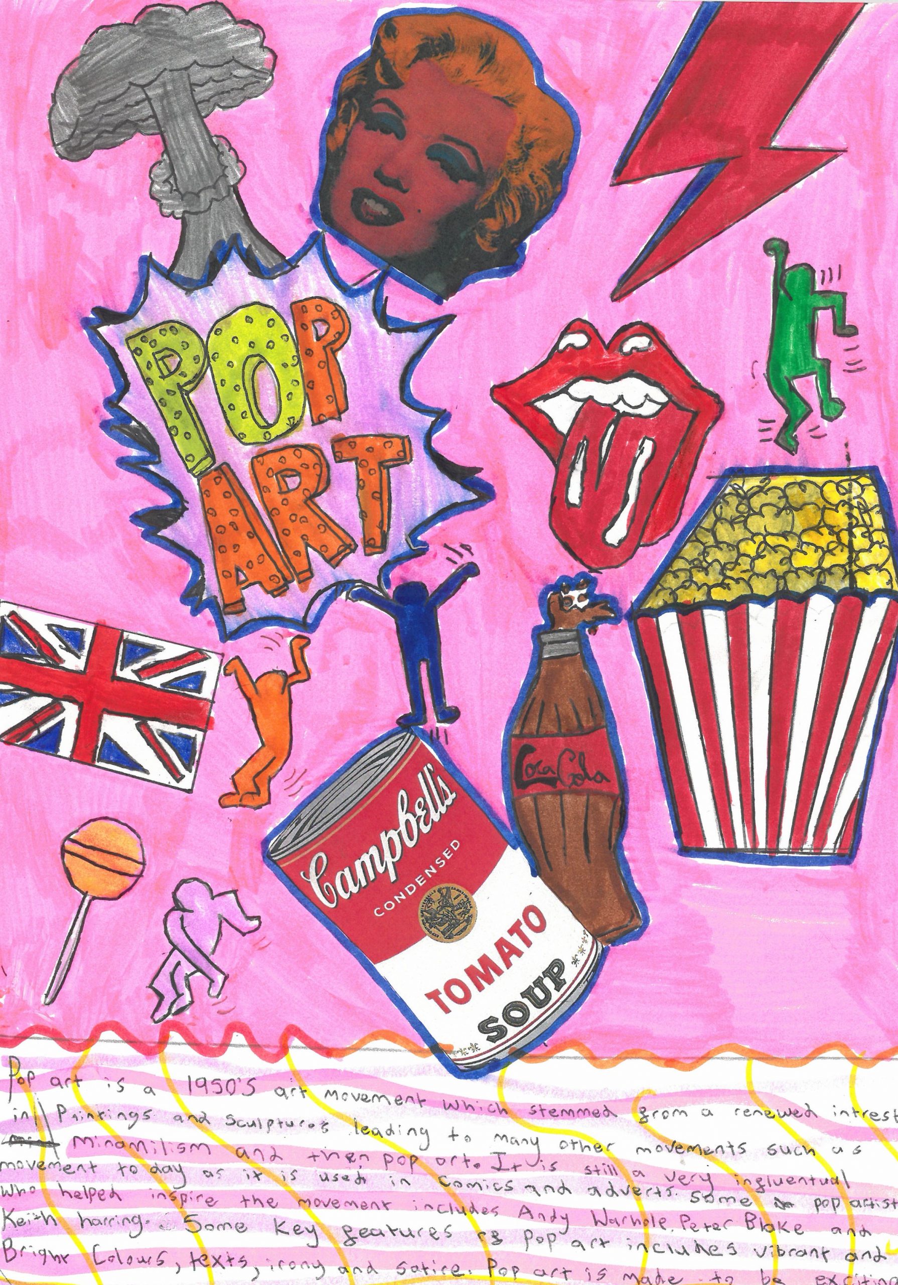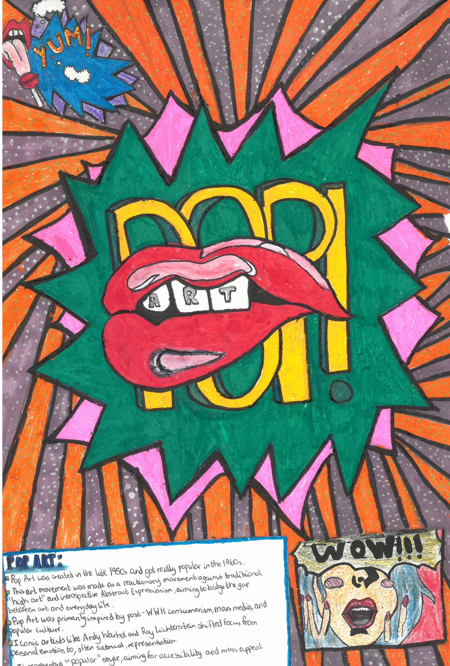 They explored the key characteristics of Pop Art by using bright, eye-catching colours, strong outlines, and playful compositions. Alongside their designs, students also included interesting facts about the Pop Art movement, helping them connect creativity with art history.