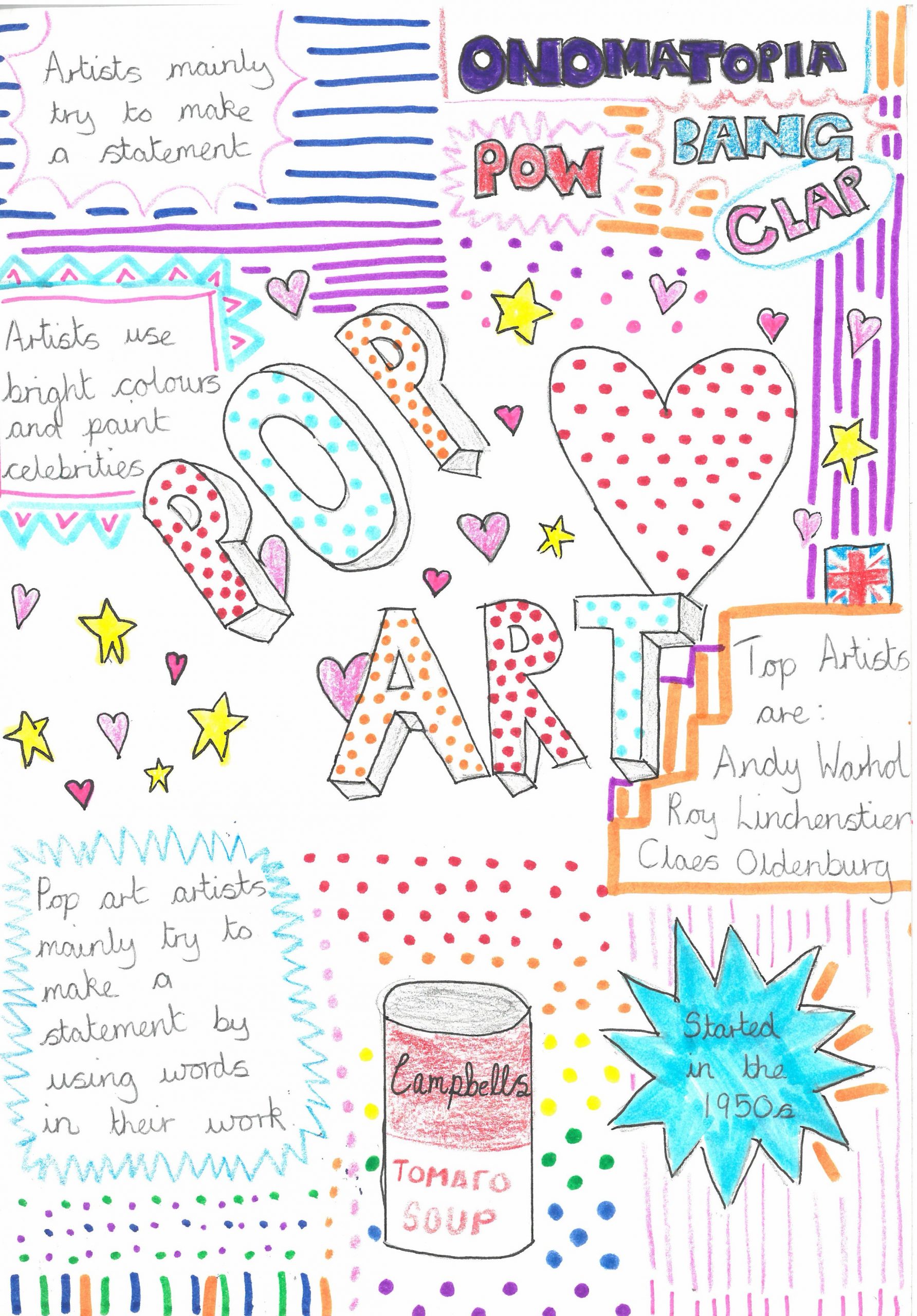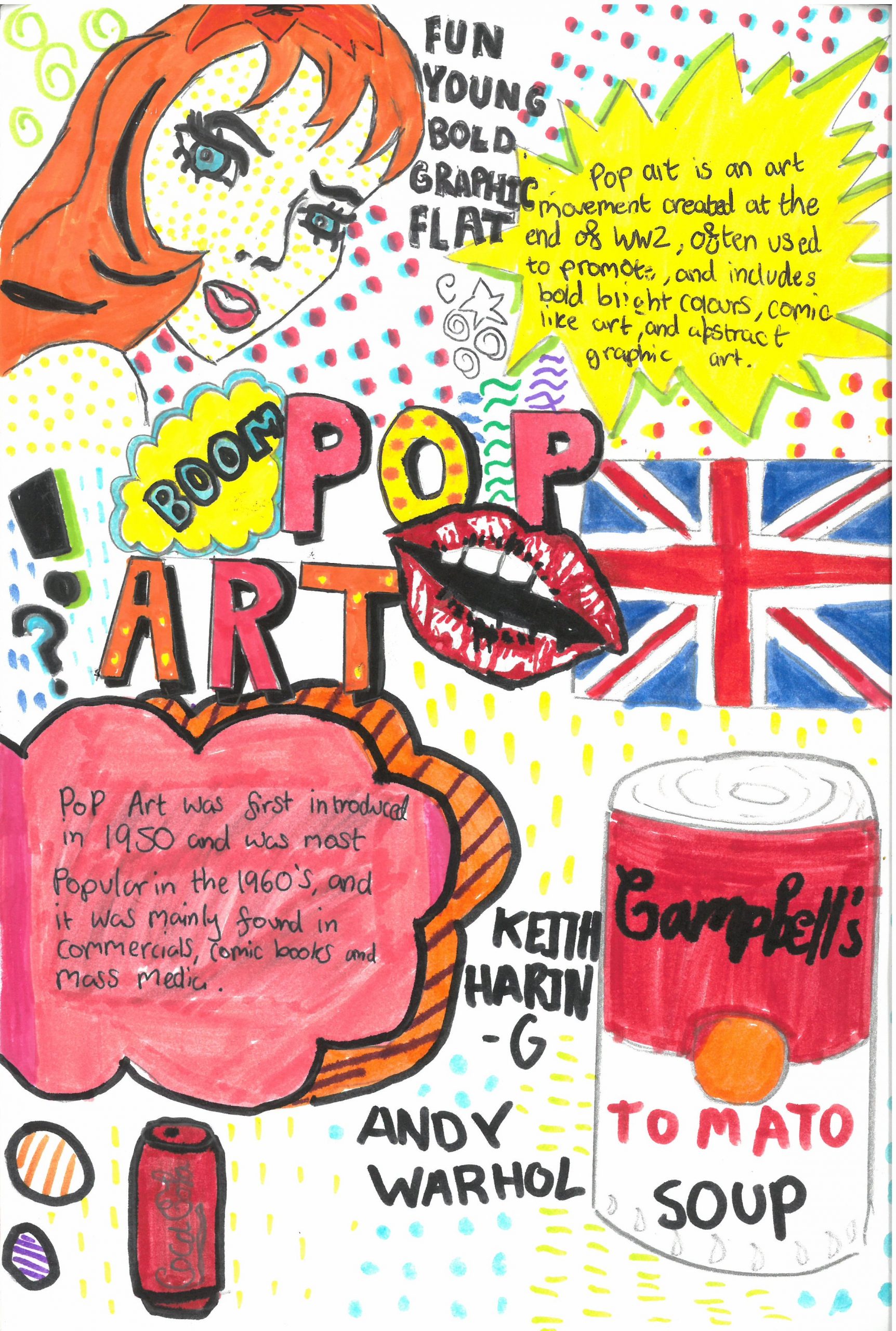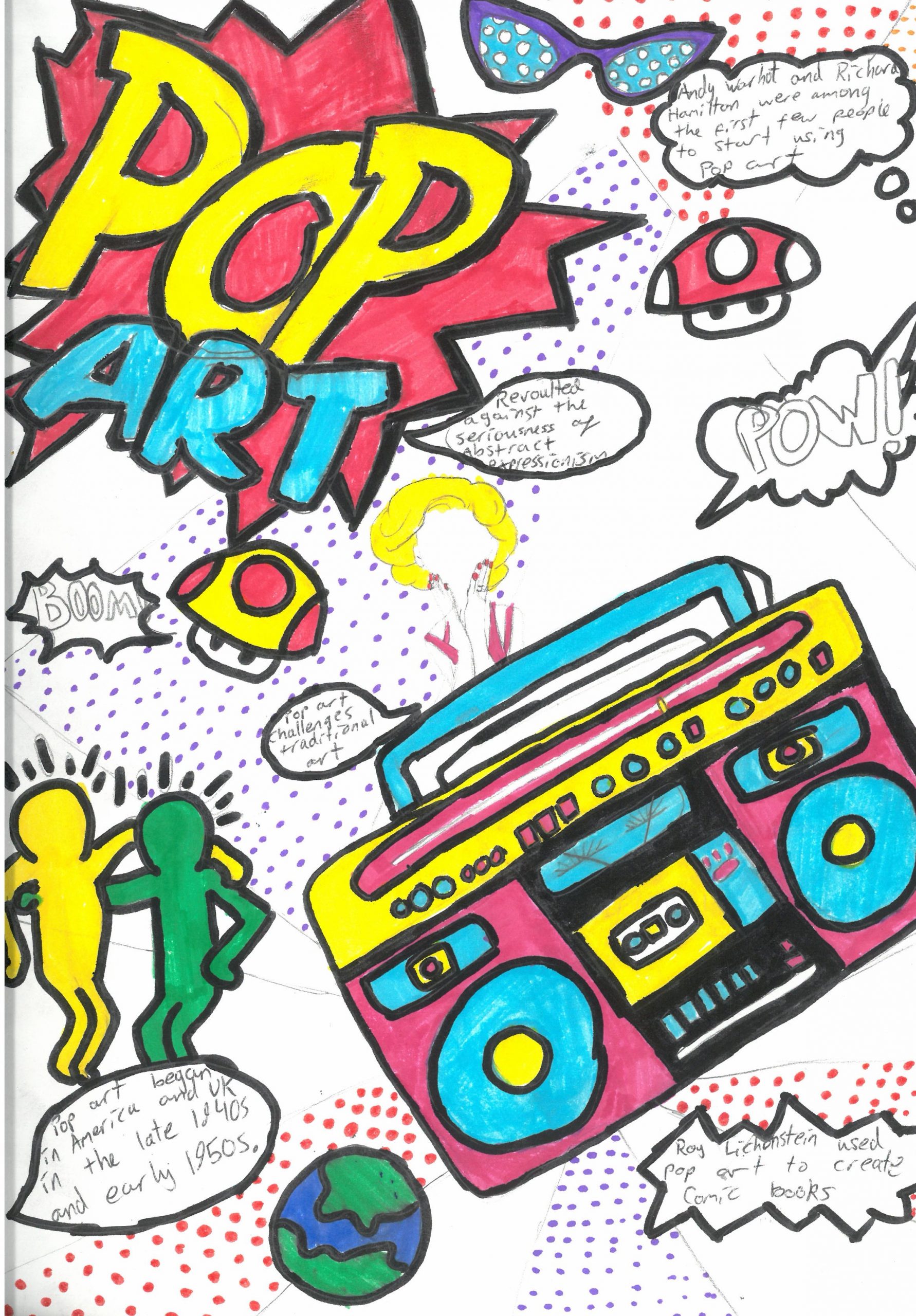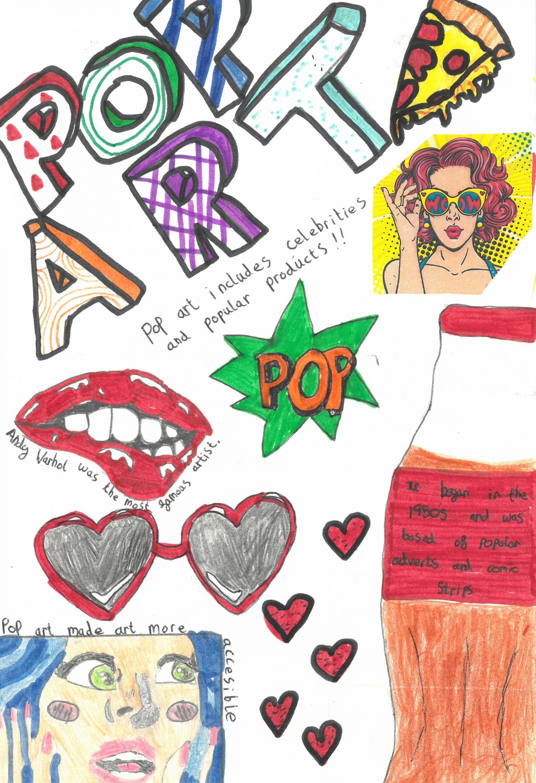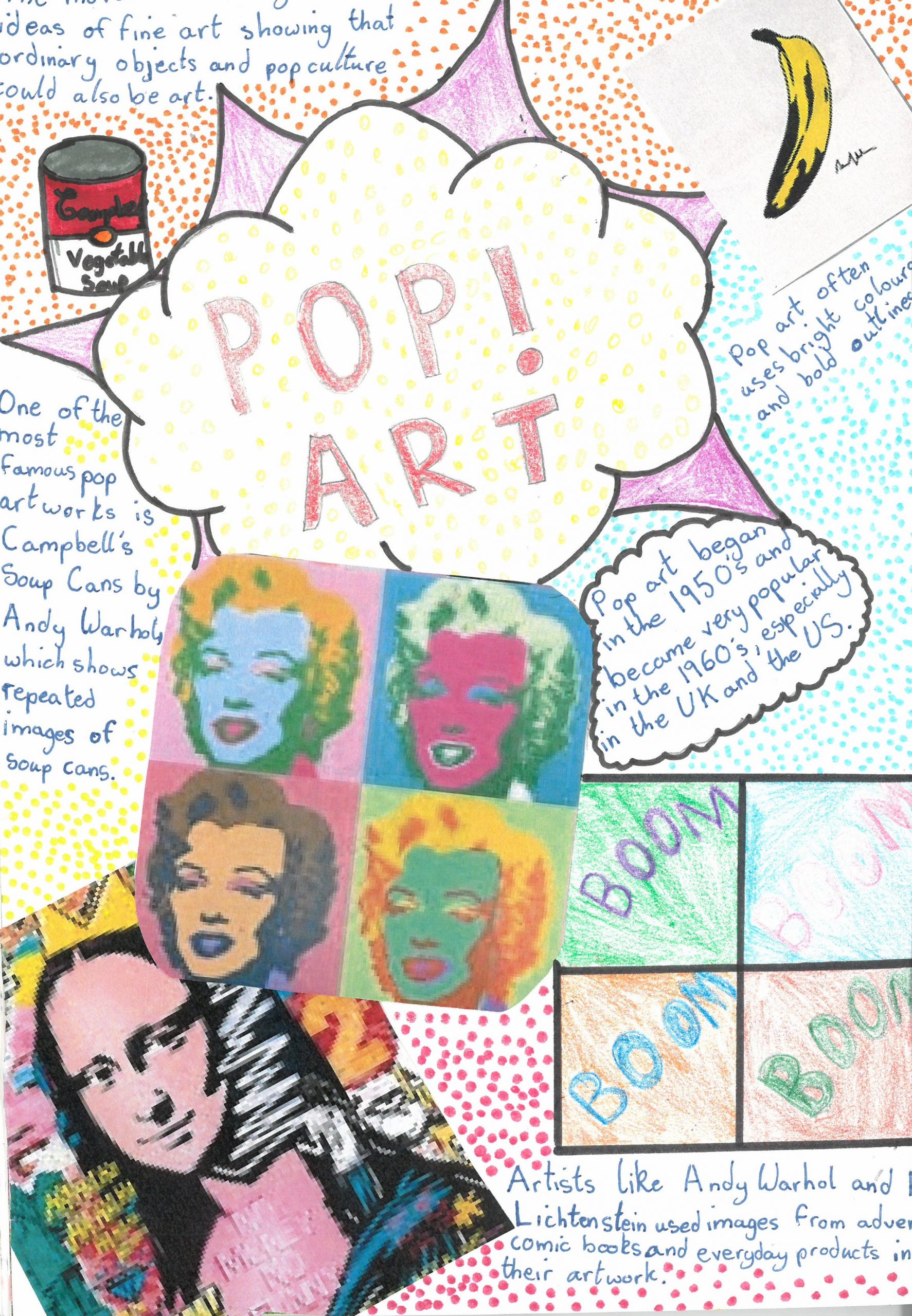They explored the key characteristics of Pop Art by using bright, eye-catching colours, strong outlines, and playful compositions. Alongside their designs, students also included interesting facts about the Pop Art movement, helping them connect creativity with art history.