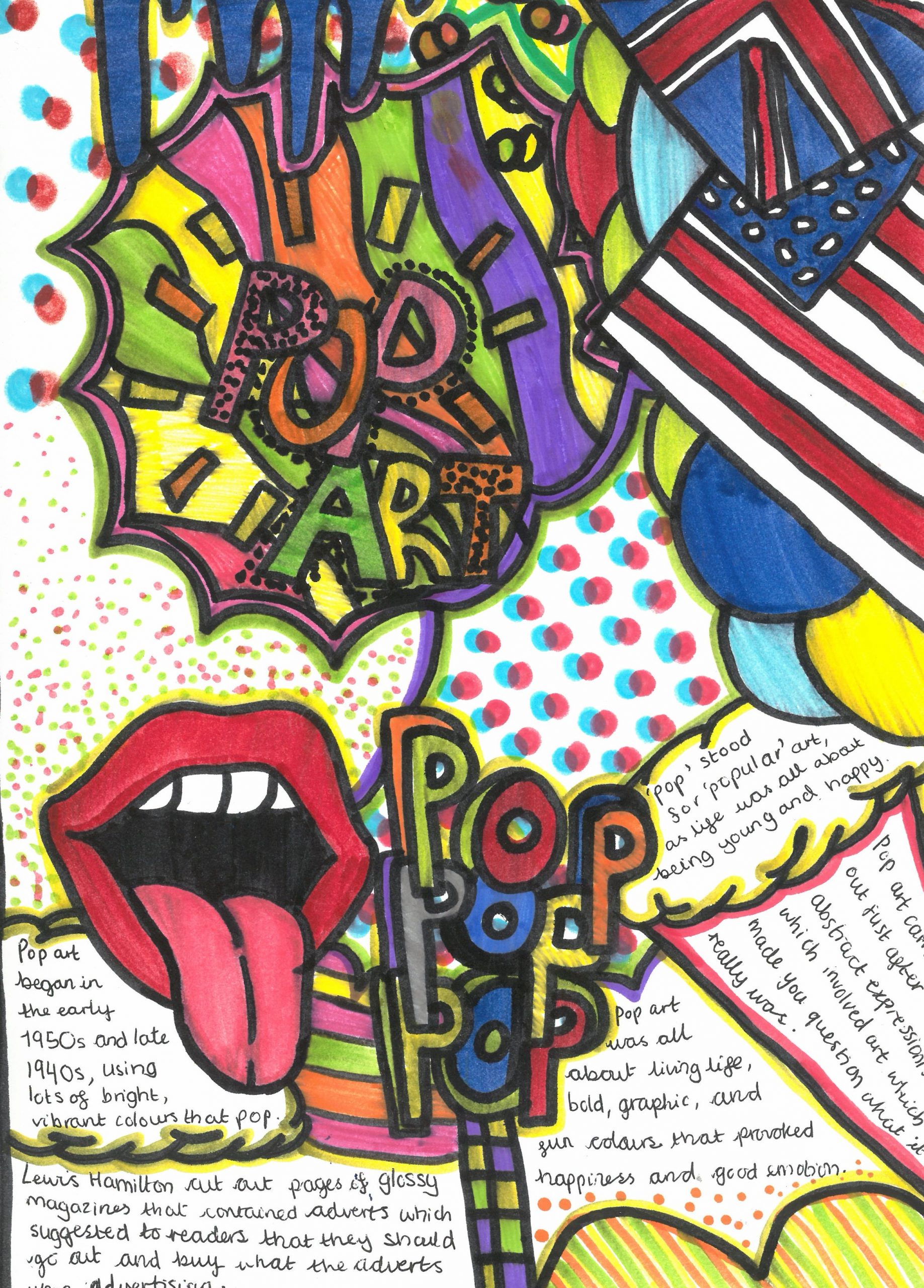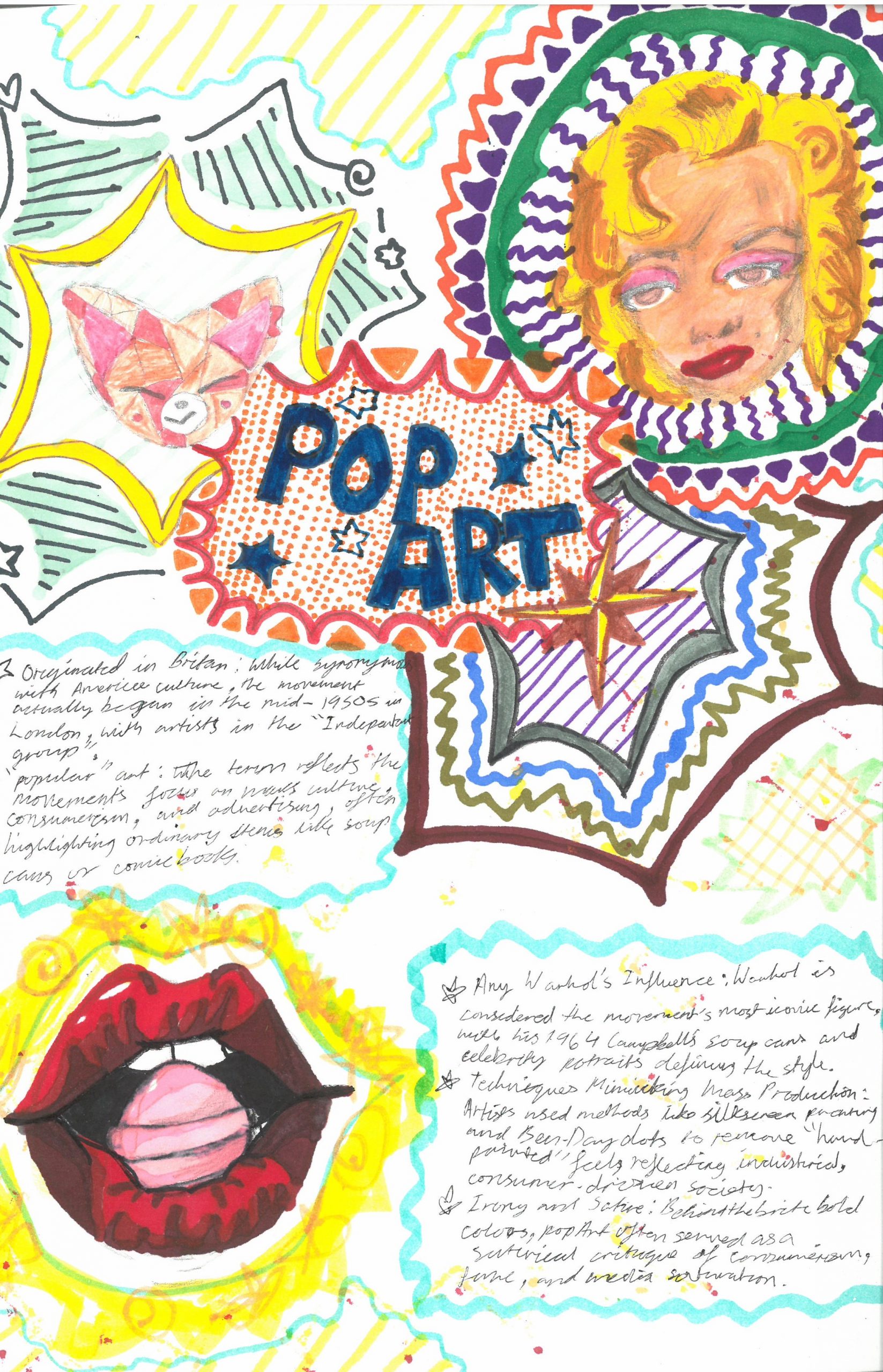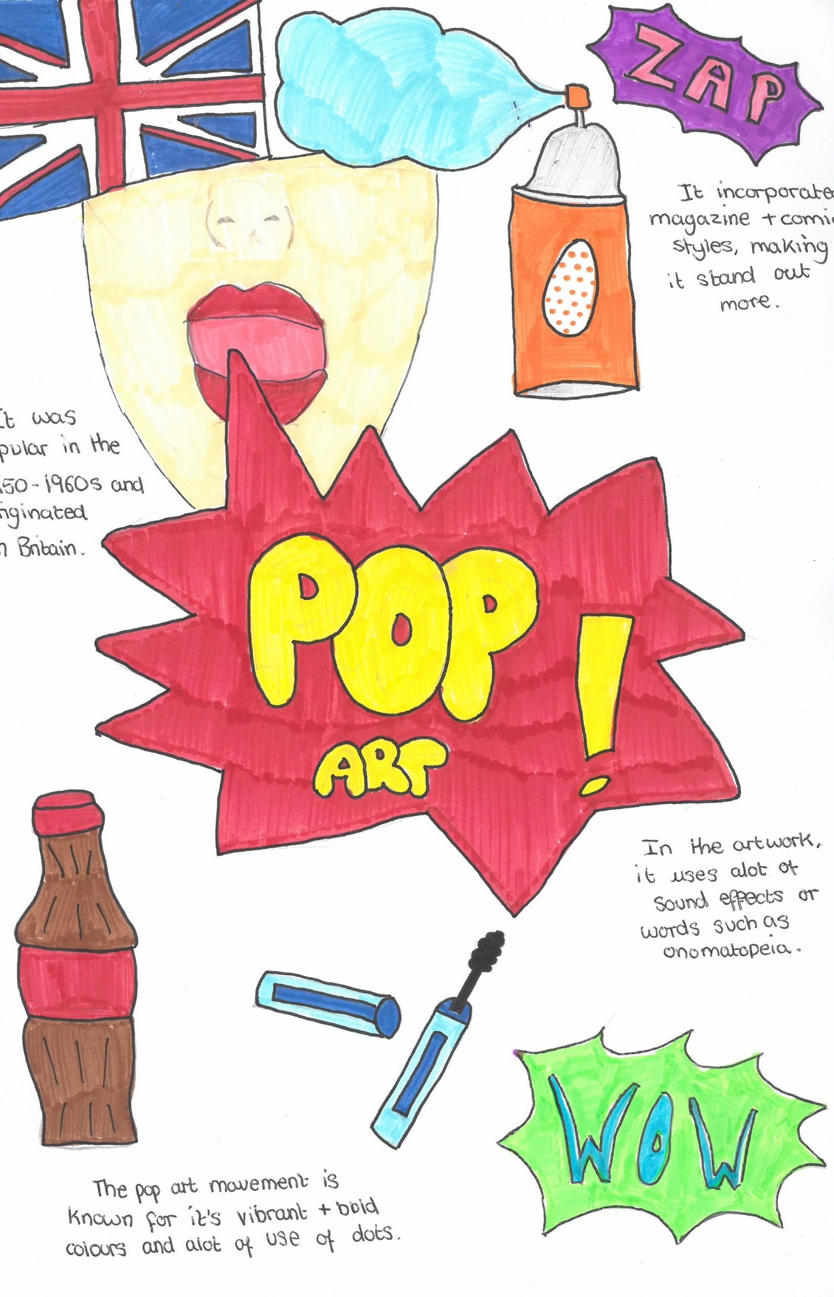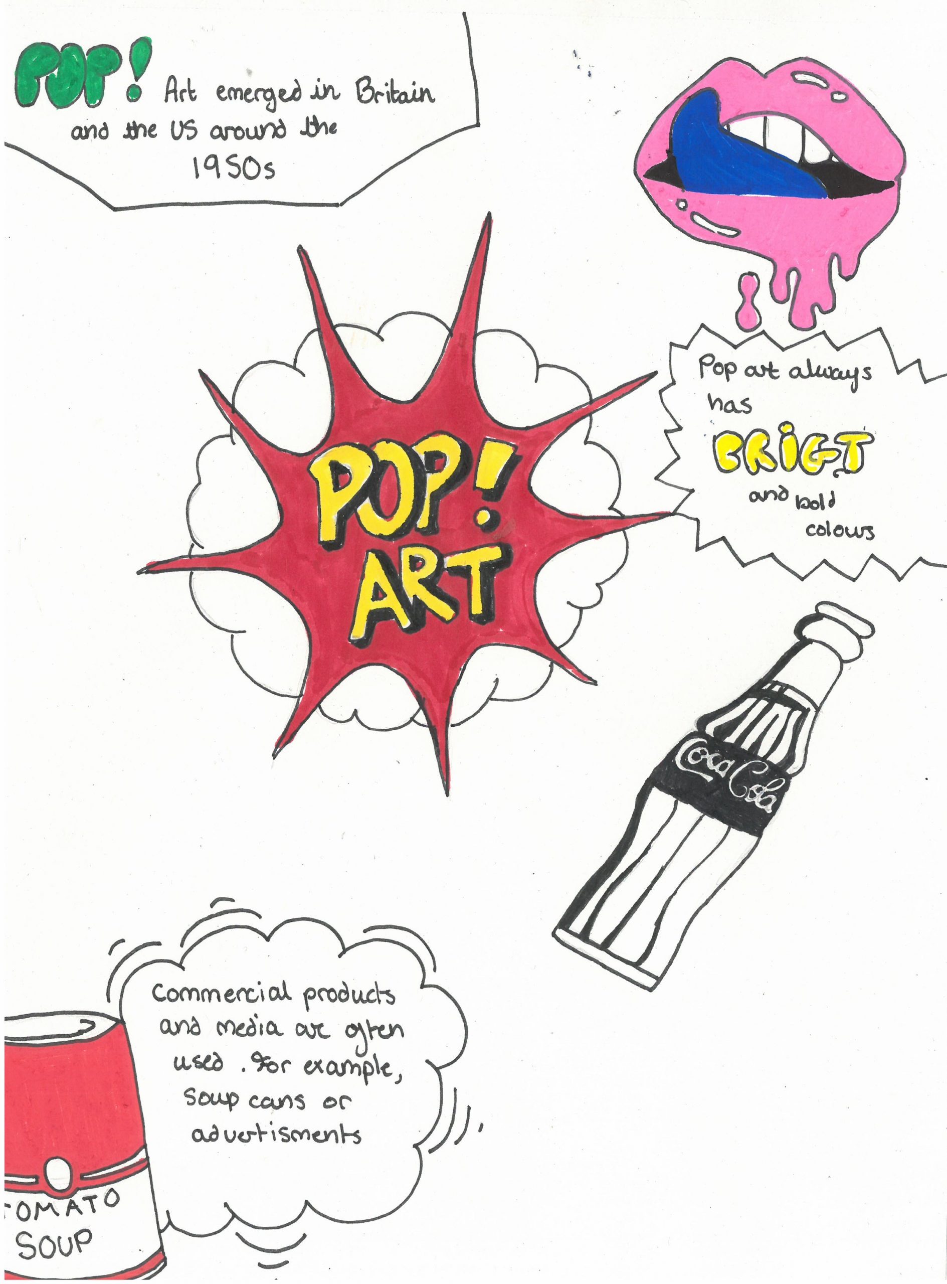 They explored the key characteristics of Pop Art by using bright, eye-catching colours, strong outlines, and playful compositions. Alongside their designs, students also included interesting facts about the Pop Art movement, helping them connect creativity with art history.