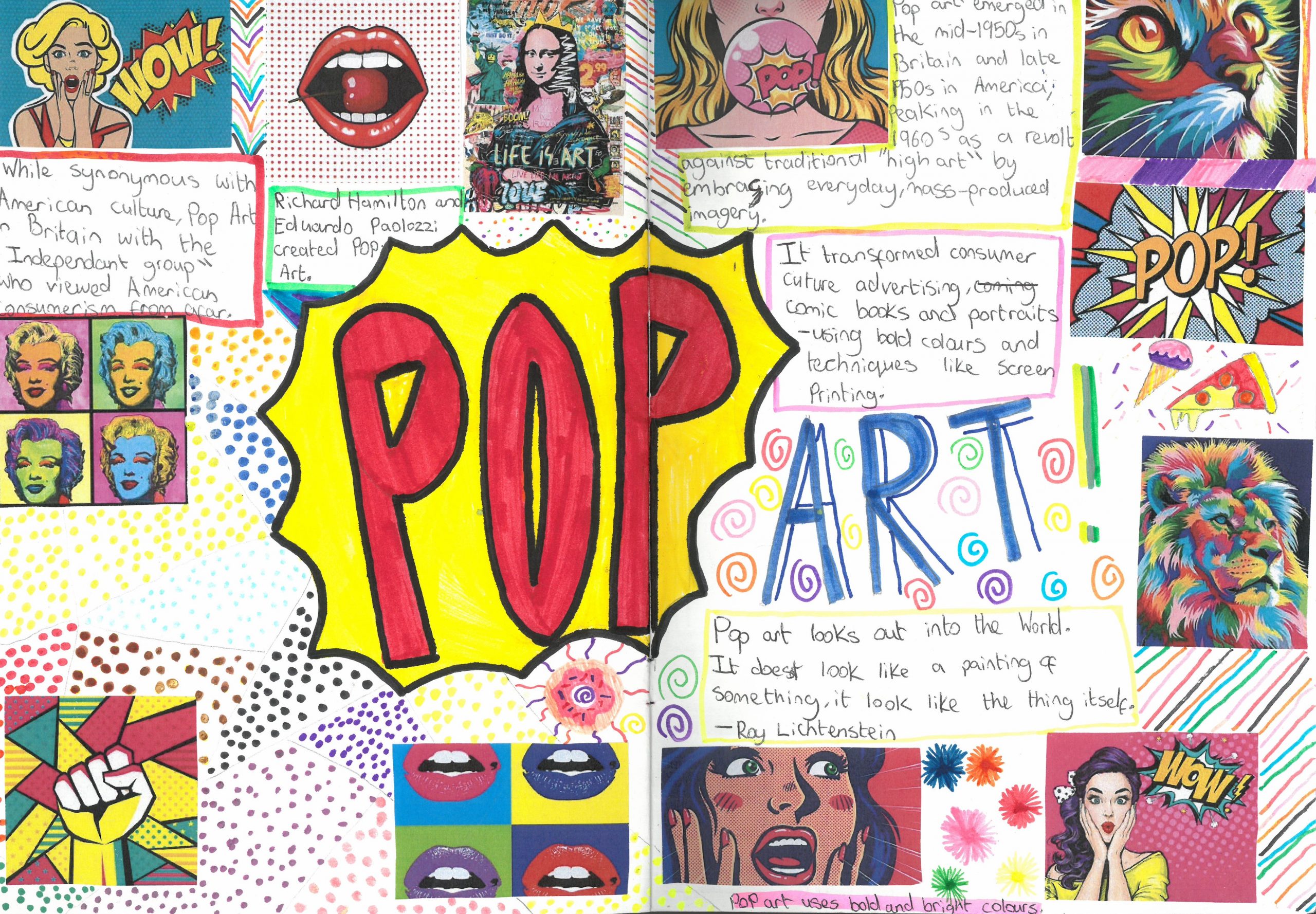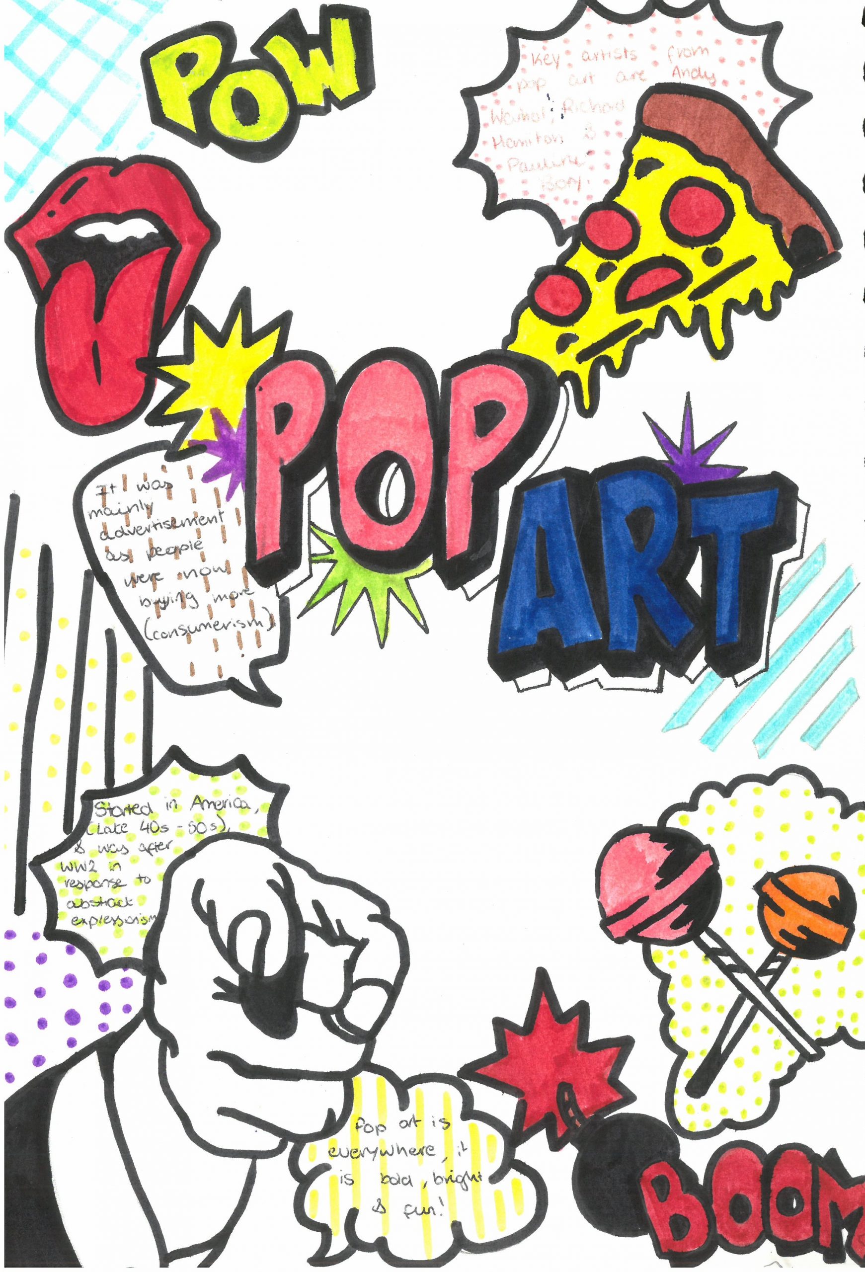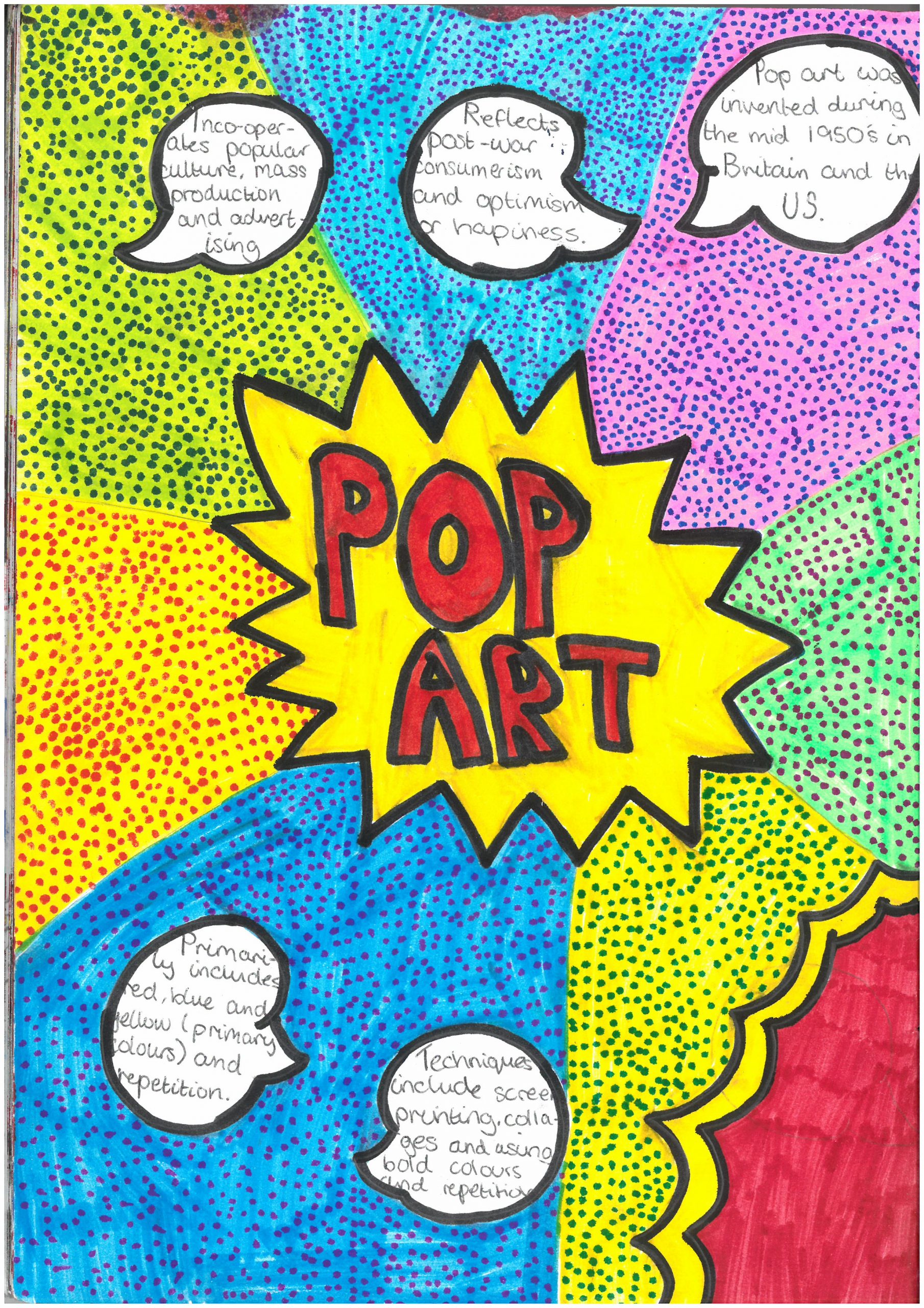 Our Year 8 students have officially begun their exciting learning journey into the world of Pop Art! As their first task, students designed a vibrant title page inspired by the bold and energetic style of the movement.