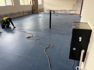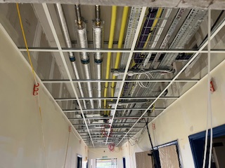 First Floor β Mechanical & Electrical 1st and 2nd fix works continue, pipe-lagging has begun, and vinyl flooring has been laid in the Science Labs.