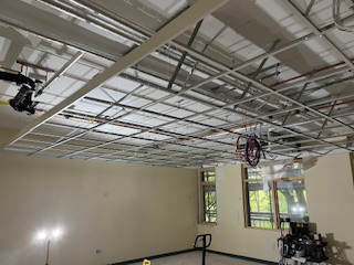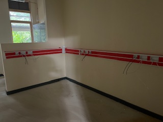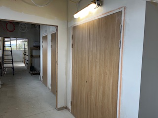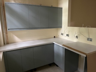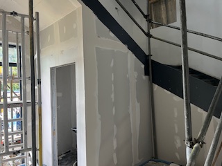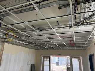 Ground Floor β Cupboards are now in place under the stairs,Β Mechanical & Electrical 1st and 2nd fix works are progressing well, ceiling grids are being installed, and the kitchenette is taking shape.